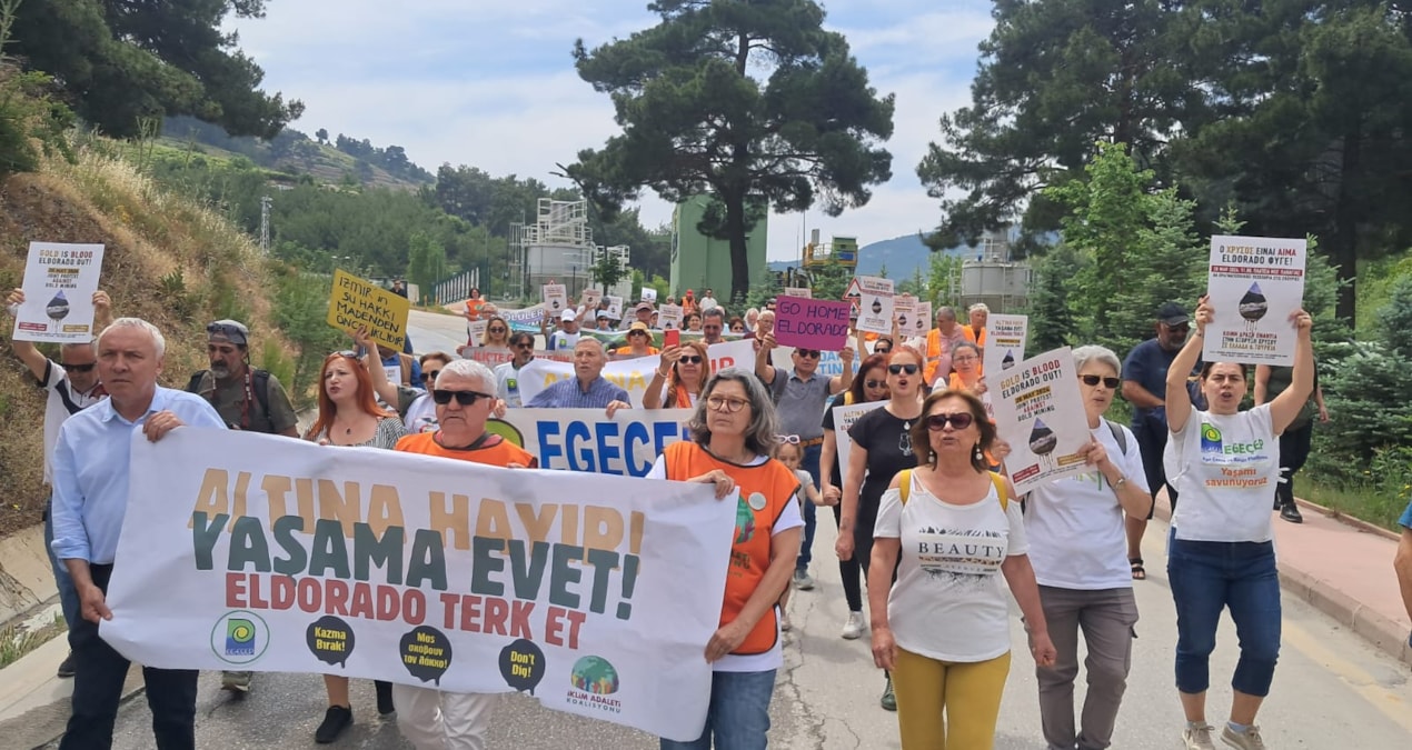 Türkiye’deki demokratik kitle örgütleri İzmir Efemçukuru’nda bulunan Eldorado Altın Madeni İşletmesi’nin önünde buluştu. Yaşam hakkı savunucuları, “Altına hayır, yaşama evet, Eldorado terk et” yazılı pankart ve Türkçe, Yunanca, İngilizce dövizler taşıdı. Temsilciler, Türkiye’de 19’u aktif, 22 altın madeni bulunduğunu, en az 20 altın madeninin de hükümetten lisans alarak faaliyete geçme aşamasında olduğunu belirtti. Açıklamada, “Türkiye’de altına verilen değerin, insan ve hayvan hayatından, karbon emisyonlarından, kültürel değerlerden, insanların geçim ekonomisinden daha fazla olduğunu, altın uğruna bunların hiçe sayıldığını biliyoruz. Bu yüzden altın madenciliğine karşı savaşıyoruz” denildi.