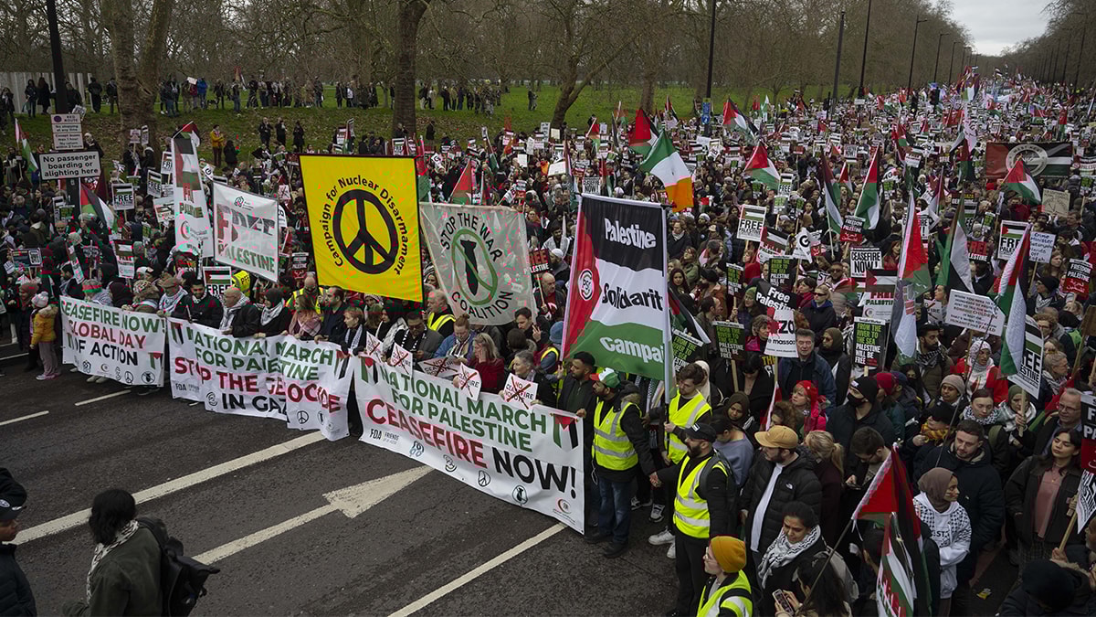 Londra’da Filistin’e destek için şehrin en işlek noktalarından Marble Arch’ta toplanan göstericiler, daha sonra İsrail’in Londra Büyükelçiliğine yürüdü.