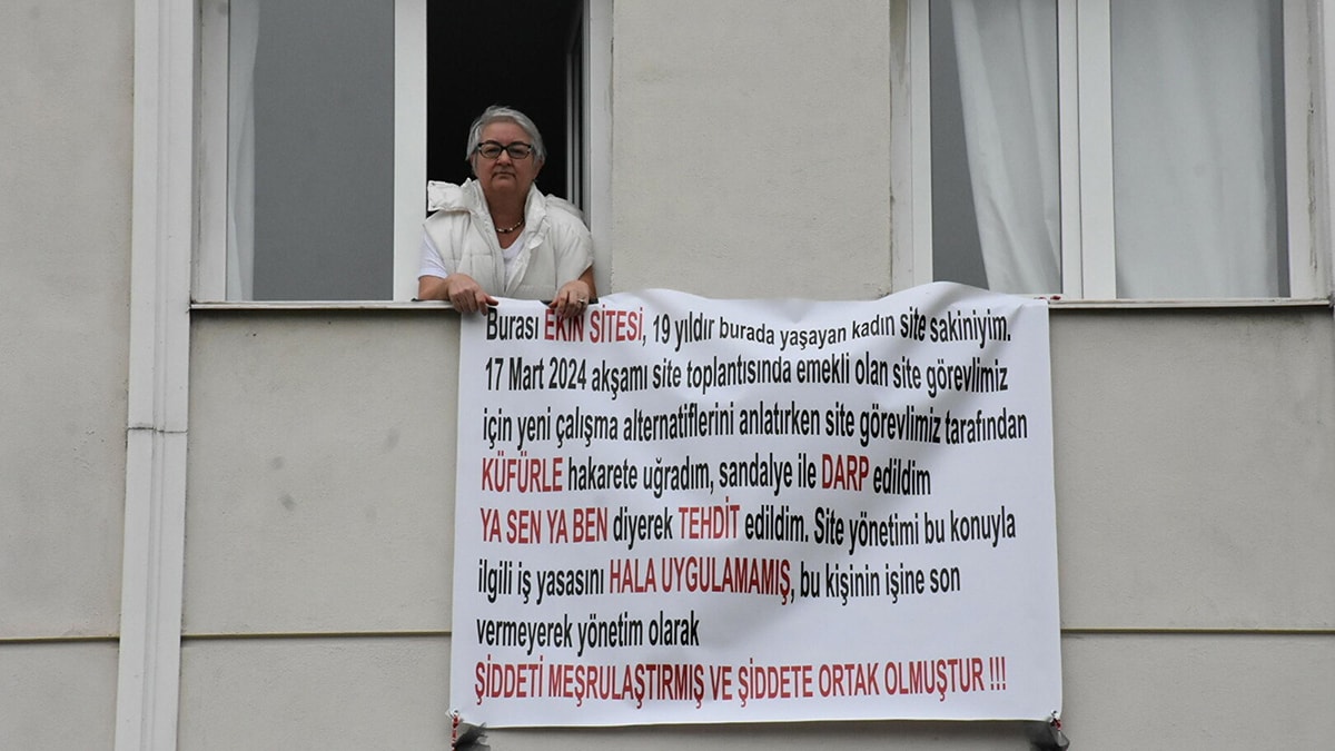 Öte yandan sesini duyurmak isteyen Aysun Bodur, oturduğu daireye ‘Burası, Ekin Sitesi. 19 yıldır burada yaşayan kadın site sakiniyim. 17 Mart 2024 akşamı site toplantısında emekli olan site görevlimiz için yeni çalışma alternatiflerini anlatırken, site görevlimiz tarafından küfürle hakarete uğradım, sandalye ile darbedildim. ‘Ya sen ya ben’ diyerek tehdit edildim. Site yönetimi, bu konuyla ilgili İş Yasası’nı halen uygulamamış. Site yönetimi, bu kişinin işine son vermeyerek şiddeti meşrulaştırmış, ortak olmuştur’ yazılı pankart astı. Aysun Bodur, şu ifadeleri kullandı;