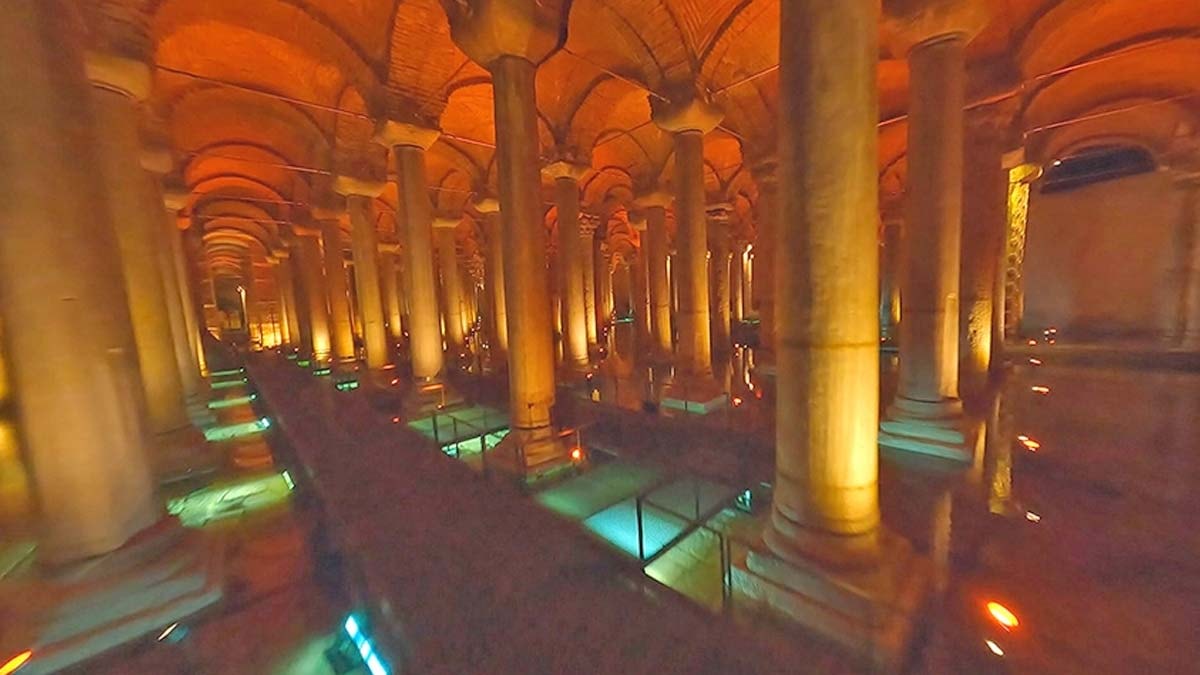 Dronun İstanbul’un en çok yerli ve yabancı ziyaretçi ağırlayan tarihi mekanlarından Yerebatan Sarnıcı’nın içindeki devasa sütunlar arasında süzülerek kaydettiği görüntüler, görkemli yapının ihtişamını gözler önüne seriyor.